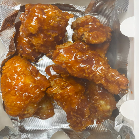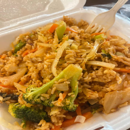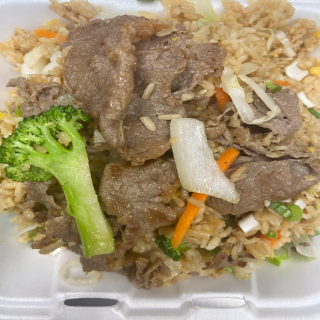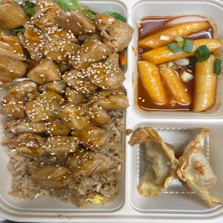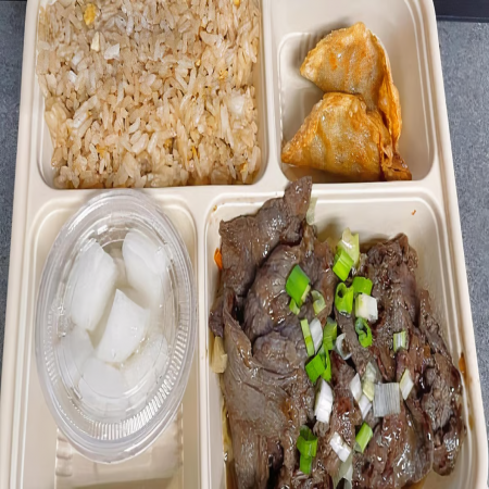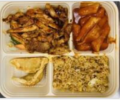 Served with white rice or fried rice, 2 fried dumplings and one side.